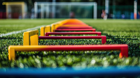 A vibrant array of agility ladders in red and yellow positioned on a lush green football field, emphasizing the importance of training equipment in sports performance.