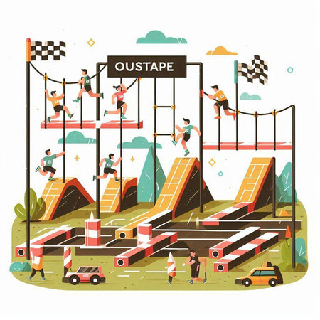 Vector flat illustration of people on the obstacle course. Concept of extreme sports.