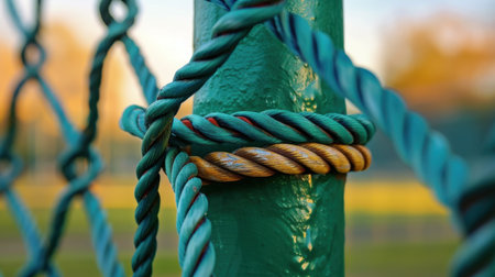A close-up image of a green and gold rope intricately tied around a post, featuring a soft background blur. The vibrant colors and textures evoke outdoor leisure and focus on nature.
