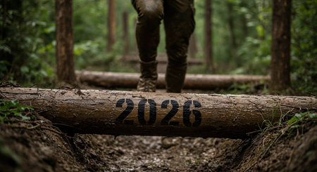 Mud-splattered boots and legs navigate a rugged forest path, crossing a prominent log clearly displaying the year 2026, symbolizing future challenges and endurance.