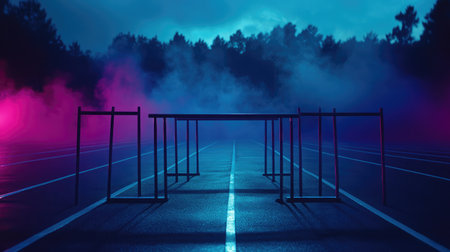 A stunning view of a running track featuring hurdles enveloped in colorful fog and illuminated by vibrant lighting, creating a surreal and energetic atmosphere for athletes.