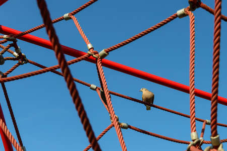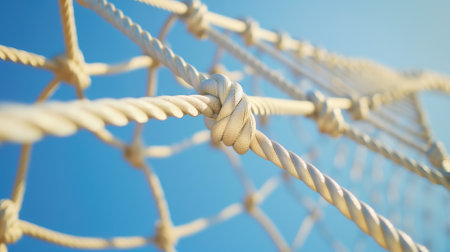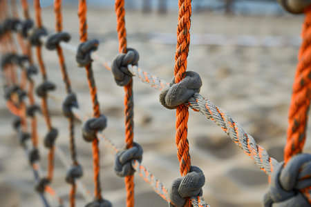 detail of a yellow connection of some blue ropes of an attraction of a children's playground