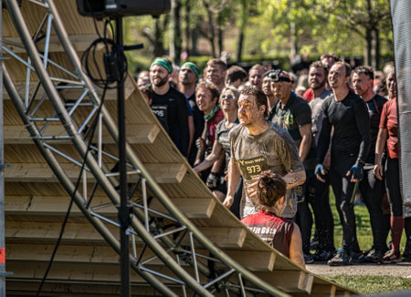 Gothenburg, Sweden - April 26 2014: Participants of the Tough Viking obstacle race in Slottsskogen trying to climb a wall.