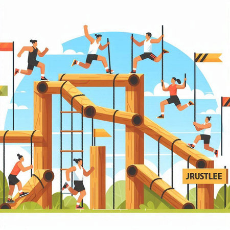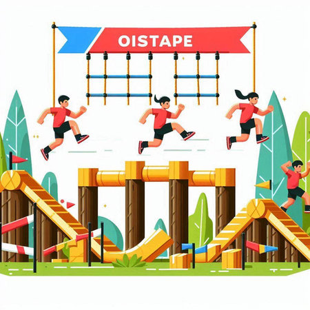 Vector illustration of people running on obstacle course. Flat style design.
