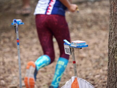 Outdoor orienteering check point activity. Extreme training or race competition