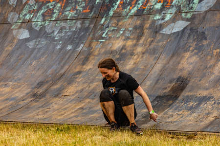Poznan, Poland - June 2021: An hard extreme obstacle course Survival Race at rainy day
