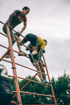Gijon, Spain - January 31, 2016: Runners into the Farinato Race, a extreme obstacle race, celebrated in Gijon, Spain, on January 31, 2016. Participants climbing metallic structure in the race.