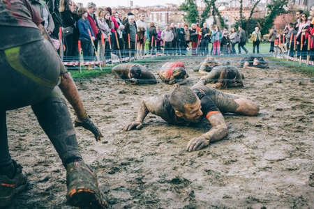 GIJON, SPAIN - JANUARY 31, 2016: The Farinato Race, a extreme obstacle race, celebrated in Gijon, Spain, on January 31, 2016. Runners awaiting to team crawling under a barbed wire in the race.