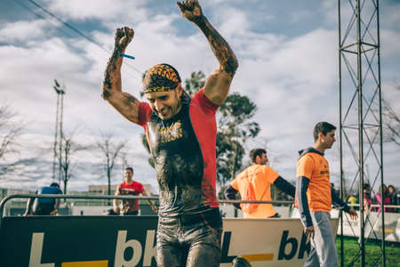 Gijon, Spain - January 31, 2016: Runner into the Farinato Race event, a extreme obstacle race, celebrated in Gijon, Spain, on January 31, 2016. Happy man raising his arms after finish a hard race.