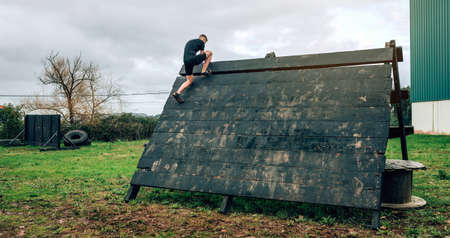 Gijon, Spain - January 31, 2016: Runner into the Farinato Race event, a extreme obstacle race, celebrated in Gijon, Spain, on January 31, 2016. Man going down a wooden wall in a test of the race.