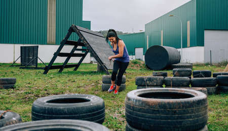 Female participant in an obstacle course dragging wheels seen from behind