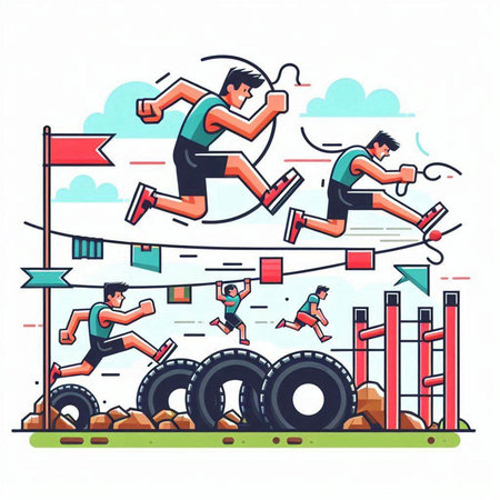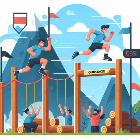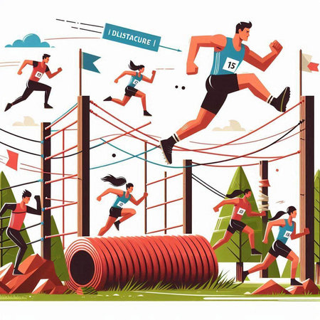 Athletes running on obstacle course. Flat style vector illustration.