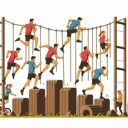 Group of people running on a rope park. Vector illustration.