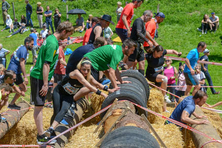 Engelberg, Switzerland - 2 June 2019: people participating at Fischerman's friend strongman run at Engelberg on the Swiss alps