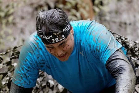 STOCKHOLM, SWEDEN - MAY 14, 2016: Man covered with mud crawling under a camouflage net in the obstacle race Tough Viking Event in Sweden, April 14, 2016