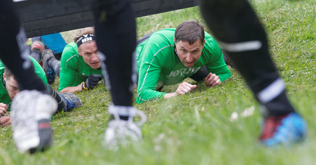 STOCKHOLM, SWEDEN - MAY 14, 2016: Group of struggling men crawling below a barb wire obstacle in the obstacle race Tough Viking Event in Sweden, May 14, 2016