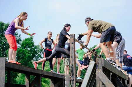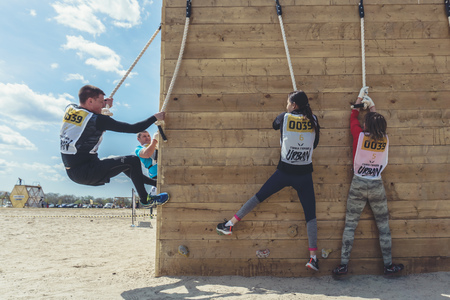 KYIV, UKRAINE - July 22, 2017: Men and women at the start overcame the barrier during the race to the legion Legion Run, held in Kiev, Ukraine, July 22, 2017
