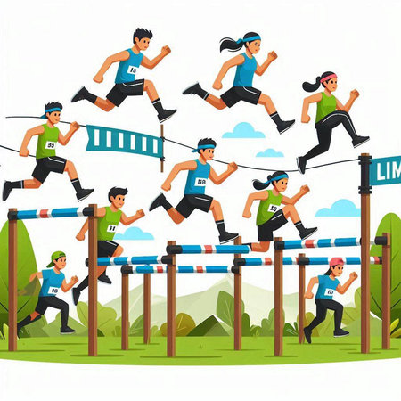 Athletics competition vector illustration. Group of people jumping over obstacle.