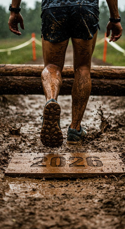 The gritty, close-up view from behind an adult athlete navigating a challenging muddy trail with wooden obstacles, highlighting the year 2026 on a board.