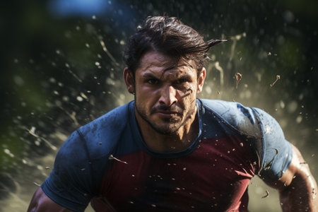 A man in a blue shirt running through mud, AI