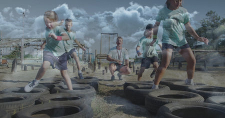 Training coach guiding children navigating tire obstacle course at outdoor park, in green shirts. Athletics, teamwork, playground, fitness, outdoor, activity, youth