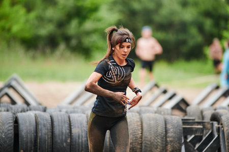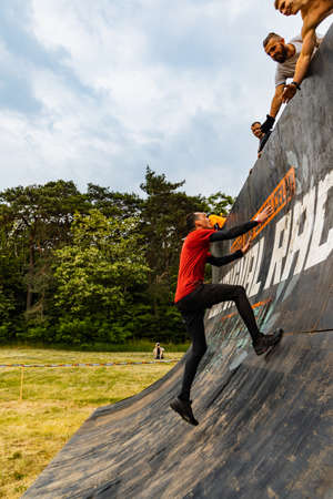 Poznan, Poland - June 2021: An hard extreme obstacle course Survival Race at rainy day