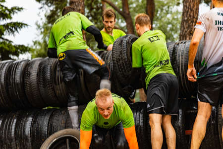 NOVOSIBIRSK, RUSSIA - 2 SEPTEMBER 2017. Young people pass the obstacle course. Mud race runners. Teamwork.