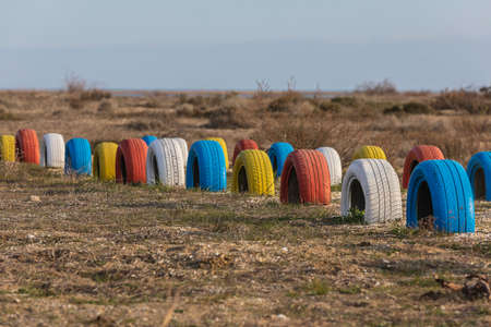 Tires painted in different colors buried in the ground