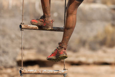 Mud race runner. The racer overcomes the obstacle by climbing the ladder