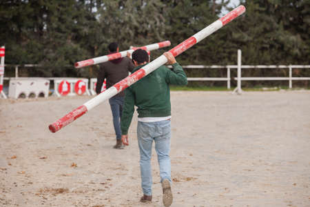 Two assistants loading obstacles poles at horse jumping competition