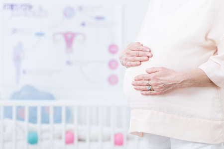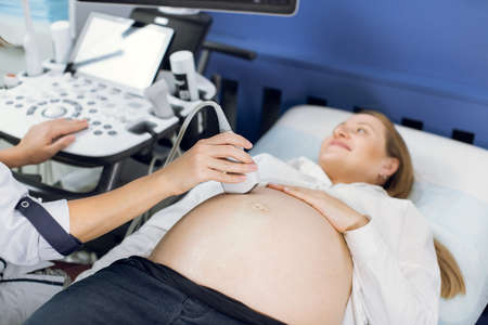 Cropped close up of a belly of happy cheerful pregnant woman having ultrasound scanning at the medical clinic. Female doctor making ultrasonic diagnostics. Focus on ultrasound transducer