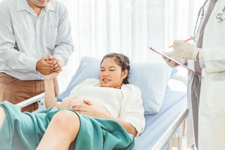 asian pregnant woman lying on bed has ultrasound scan with husband and doctor explains the results with digital tablet in hospital