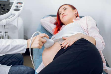 Close up of female obstetricians hands, using modern ultrasound equipment for screening belly of young hipster red haired pregnant woman at modern clinic. Third trimester pregnancy concept