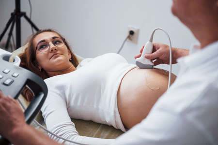 Gynecologist using ultrasound transducer on belly of expectant mother, monitoring baby development during pregnancy