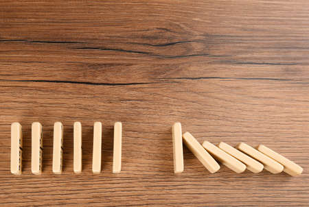 A professional businessman hand intervening to stop a row of falling wooden domino blocks on a desk to demonstrate successful risk management and crisis prevention strategy.