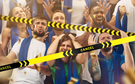 Lockdown. Belgian soccer, football fans cheering for favourite sport team with bright emotions behind the limiting tapes with Cancel. Look excited, supporting, wondered. Blocked social life.