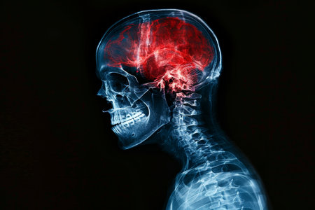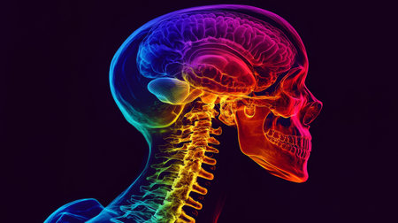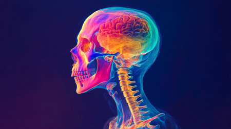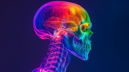 Colorful x-ray illustration of human skull and brain side view, medical and anatomical concept