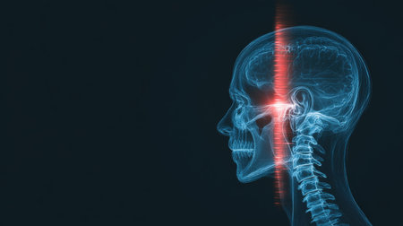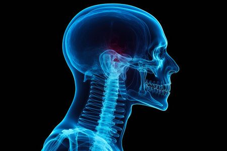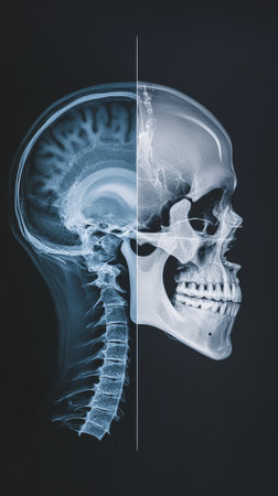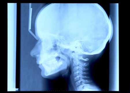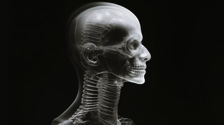 Medical science xray image of human head and neck with skeleton in background for analysis and diagnosis