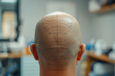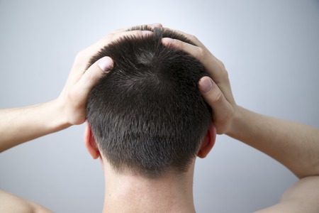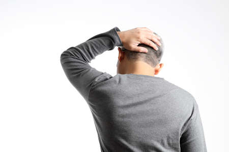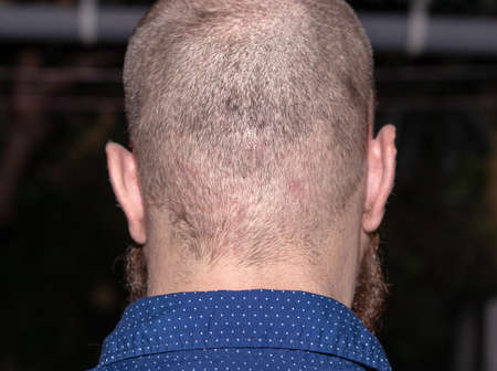 Back view of a bald man suffering from scalp acne, red itchy dots on the back of the head
