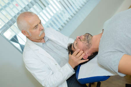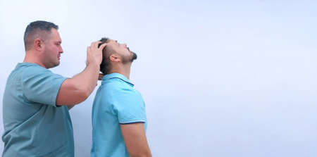 Man on preventive examination of doctor chiropractor on neck diagnostic, side view. Manual therapist turning patients head in different sides to make a diagnosis and find problem. Manual physician.