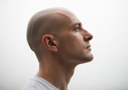 A man with a bald head is captured in a profile view, his gaze directed upwards. The image conveys a sense of contemplation and upward aspiration.
