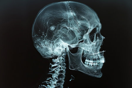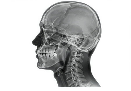 A clear side view X-ray image showcasing the intricate details of a human skull and the upper portion of the cervical spine.