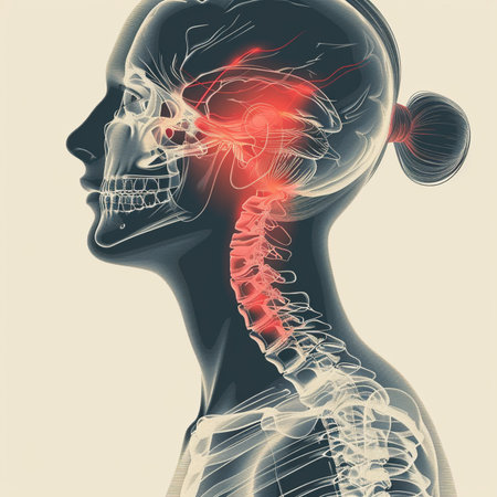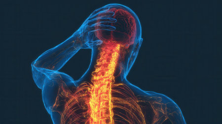 Close-up view of the human spine and nervous system, highlighting the cervical and thoracic regions with a vibrant orange glow against a dark blue background.