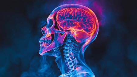 X-ray profile of human skull with glowing brain, medical illustration. Neuroscience and anatomy concept
