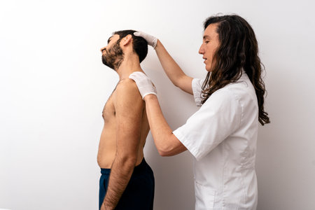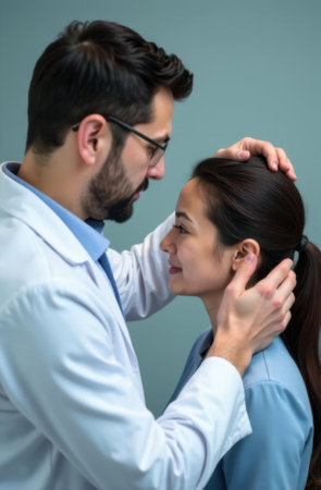 Male doctor examining female patient's head and neck, offering a reassuring touch and personalized care while fostering trust and empathy in a supportive medical environment