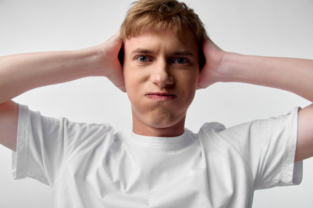 A frustrated man holds his head with both hands, showing discomfort and stress in a studio setting, wearing a white t shirt, conveying tension and mental strain