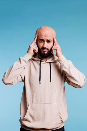 Arab man with migraine rubbing temples and looking at camera with pain grimace portrait. Young adult arabian bald bearded person touching head while suffering from headache
