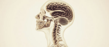 An illustration shows a side view of a human skull with transparent detailing revealing the brain and spinal cord highlighting anatomical features.