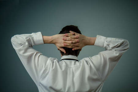 A businessman holding hands behind his head fingers crossed, relaxing after hard work.
