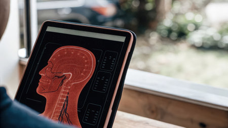 A graphical representation of a head and neck region featuring an augmented reality health dashboard that tracks neurological health indicators and cognitive tasks in interactive.